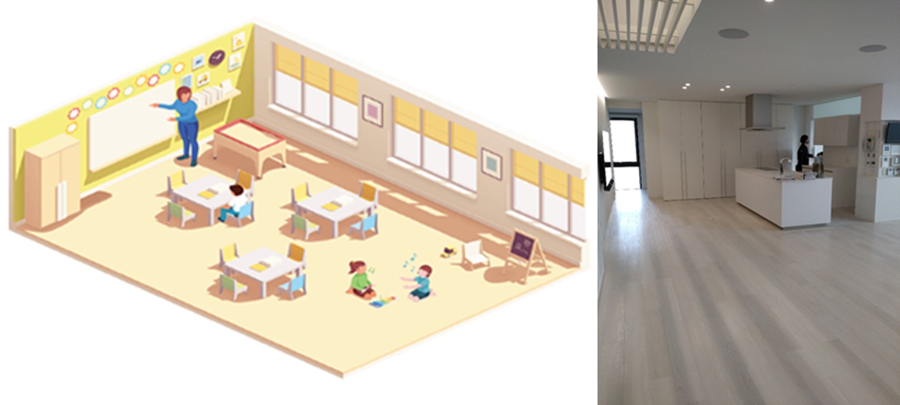 - 床下高15㎝前後の置床工法にFRaTacs材を組み込むだけの一括施工で、マンション・住宅及び保育施設・オフィス等の中小フロアーに適しています。